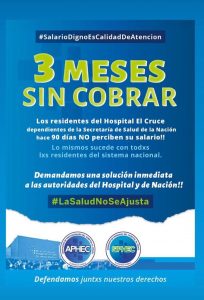La semana pasada hubo una asamblea de residentes y se decidió realizar mañana por la mañana una concentración en la puerta de los hospitales en busca de alguna respuesta y movilizar al Posadas (donde ya hubo despidos de profesionales) 14:30 para visibilizar su problema, ser escuchadxs por las autoridades, transmitir a lxs pacientes la importancia del rol del residente para la acorde atención en las instituciones y organizar un paro próximo con movilización al ex-Ministerio de Salud de la Nación.