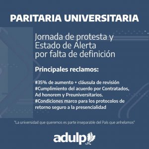 (26/04/2021) Este lunes 26 abril, la Asociación de Docentes de la Universidad de La Plata (Adulp) lleva a cabo una jornada de protesta. El fin de esta es visibilizar el reclamo salarial del sector universitario. El mismo se realizará a través de las redes sociales y aulas virtuales.