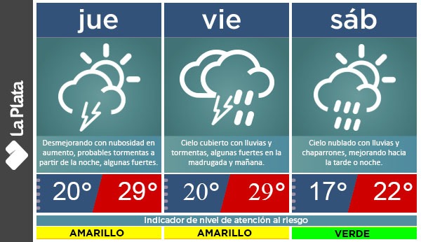 «Desde la noche de este jueves 8 de abril el partido de La Plata estará afectado por precipitaciones en forma de lluvias y chaparrones, algunas de fuerte intensidad, con tormentas eléctricas», indica el reporte. Además, se esperan ráfagas de viento de hasta 50 kilómetros por hora.