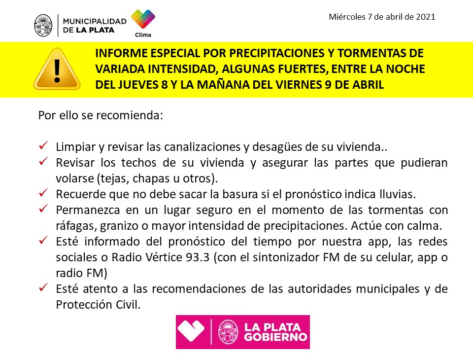 (08-04-2021) La Dirección local de Hidrometeorología emitió un reporte donde prevé fuertes lluvias y tormentas eléctricas para las próximas horas. No se descarta la caída de granizo. La Municipalidad de La Plata estableció de forma preventiva el Nivel de Atención del Riesgo (NAR) Amarillo