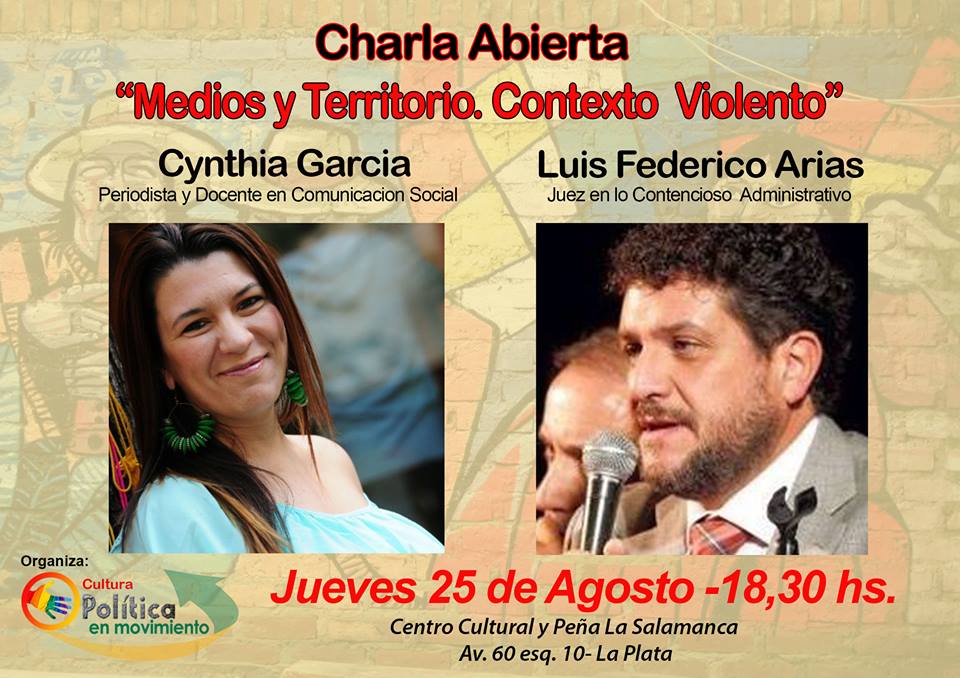 (20/8/2016) Este jueves a las 18.30hs en el centro cultural La Salamanca, calle 60 esq. 10, la periodista y docente Cintia García y el Juez en los contencioso administrativo, Luis Arias, darán una charla titulada «Medios y territorio. Contexto violento». Al respecto, el director del centro cultural, Luis Salamanca conversó con A la Cama Sin Postre y contó: «En el contexto político y social que vivimos bastante turbulento, desde la cultura vemos todo esto bastante peligroso. Hace un buen tiempo desde nuestro espacio decidimos intervenir y no ser pasivos a ese contexto. Nunca lo fuimos, pero en este último tiempo decidimos construir un espacio que se llama «Cultura política en movimiento y alude a esta idea de desentrañar de algún modo y poder pensar el territorio».