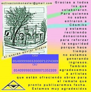 «Con los mensajes de solidaridad de artistas amigues surgió la idea de hacer una subasta online de obra para recuperar gastos, porque si pudieron rompler una reja tenemos que sacar todo y poner unas más gruesas, por lo tanto, más caras. Se han sumado desde todos lados, y eso más el apoyo de la Red Multicultural, estamos gestionando el acceso a algún subisidio desde el estado para poder pasar la cuarentena».
