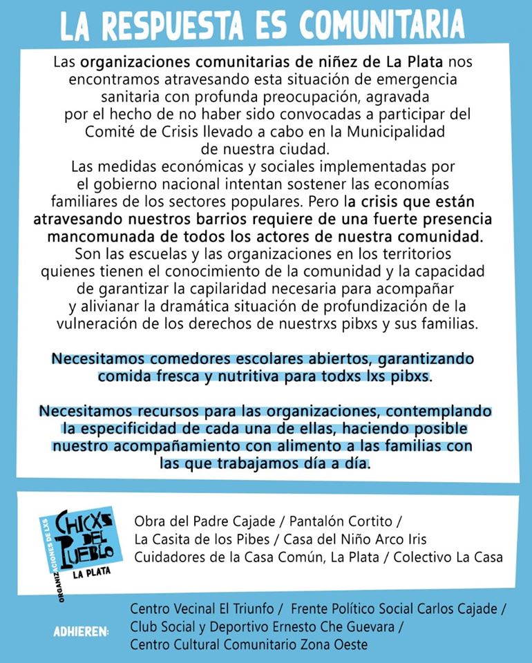 A propósito, las Organizaciones de Niñez de La Plata, publicaron el siguiente comunicado: