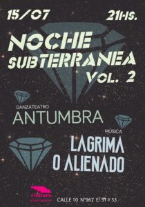Esta nueva edición contará con la interpretación de la obra de danza-teatro “Antumbra”, dirigida por Constanza Copello, y de la banda Lágrima O Alienado, que está terminando su disco debut: “Este proyecto nace con Laura Mastontuono, con quien venimos tocando hace mucho tiempo en otros proyectos, por ejemplo en Película, o Cipreses. Trabajamos con baterías electrónicas, sintetizadores, grabando en casa y trabajando las visuales con una cuestión poética ya que hemos recorrido otras disciplinas como la fotografía, el dibujo, gente que te crea visiones que te rompen la cabeza y vas adquiriendo otras experiencias, nutrido de estos espacios”.