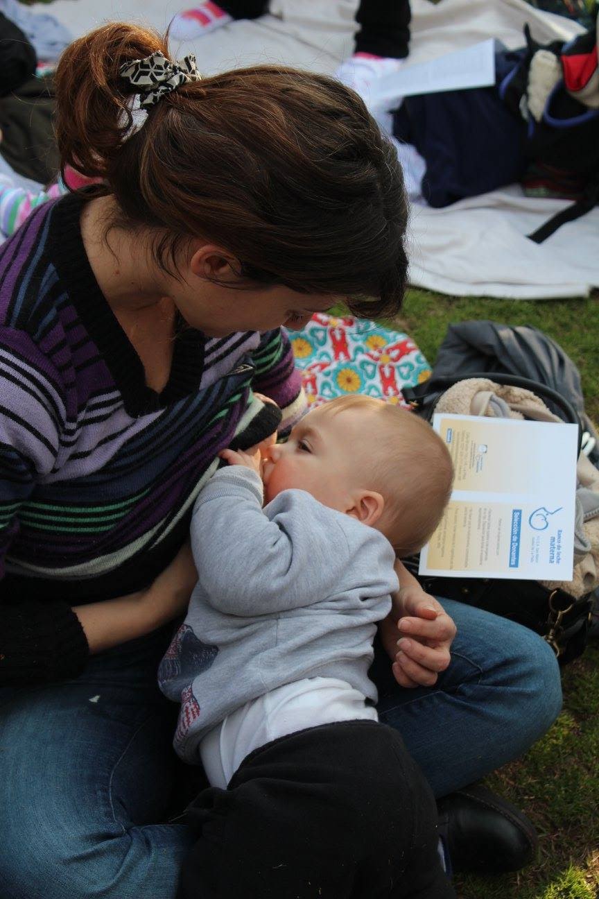 Ahora bien, volvamos al tetazo masivo, un día radiante, cálido, el sol nos acompañó en toda la jornada. Mujeres de todas las edades y procedencias nos reunimos allí. ¡Ojo! La cosa no era sólo de mujeres: los hombres estuvieron presentes, amigos, compañeros y maridos, todos acompañando la jornada lactante. Reposeras, mantas sobre el césped, mates, carteles, globos, alguna que otra torta compartida, bizcochitos, niños (¡muchos!) y teta, mucha teta que continuaba su línea en curvatura para terminar en una boquita feliz prendida de ella.