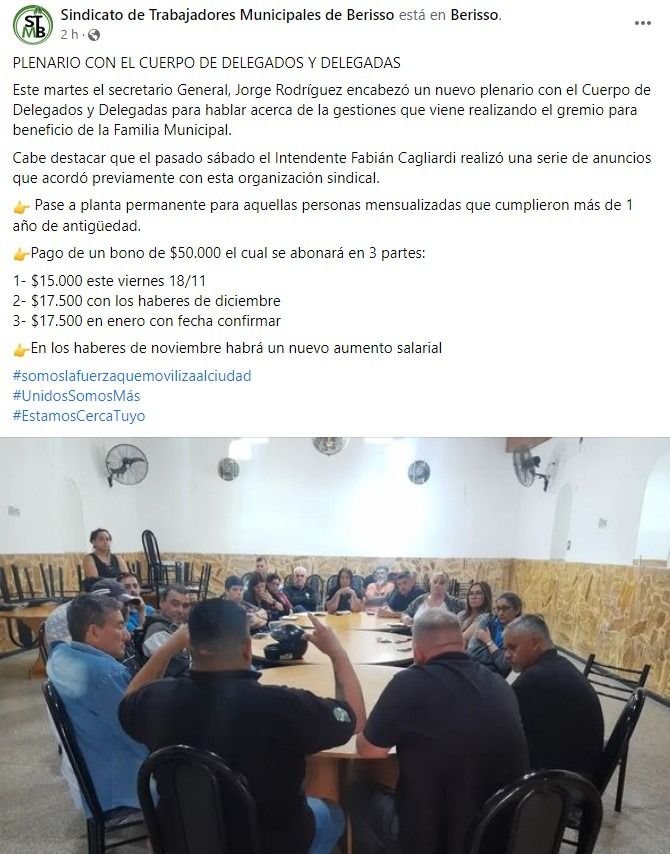 En el plenario con el Cuerpo de Delegados de STMB, el secretario General del gremio, Jorge Rodríguez, comunicó las gestiones que viene realizando el gremio y confirmó dos importantes anuncios: el pago del bono, que se dividirá en $15.000 a cobrar el próximo, $17.500 con los haberes de diciembre y $17.500 en enero con fecha confirmar; y el pase a planta permanente de toes les trabajadores mensualizades con más de un año de antigüedad.