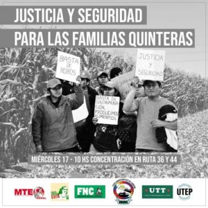 Varías organizaciones de trabajadorxs de la tierra levantaron la voz por éste reclamo y harán una conferencia de prensa para visibilizar la inseguridad, exigir respuestas y políticas públicas para el sector. Hace unos días, cuatro delincuentes entraron a robar armados y uno de ellos, con la complicidad de los demás, violó a una chica de 14 años. También el reclamo de hoy es por «justicia y reparación» para la joven y su familia.